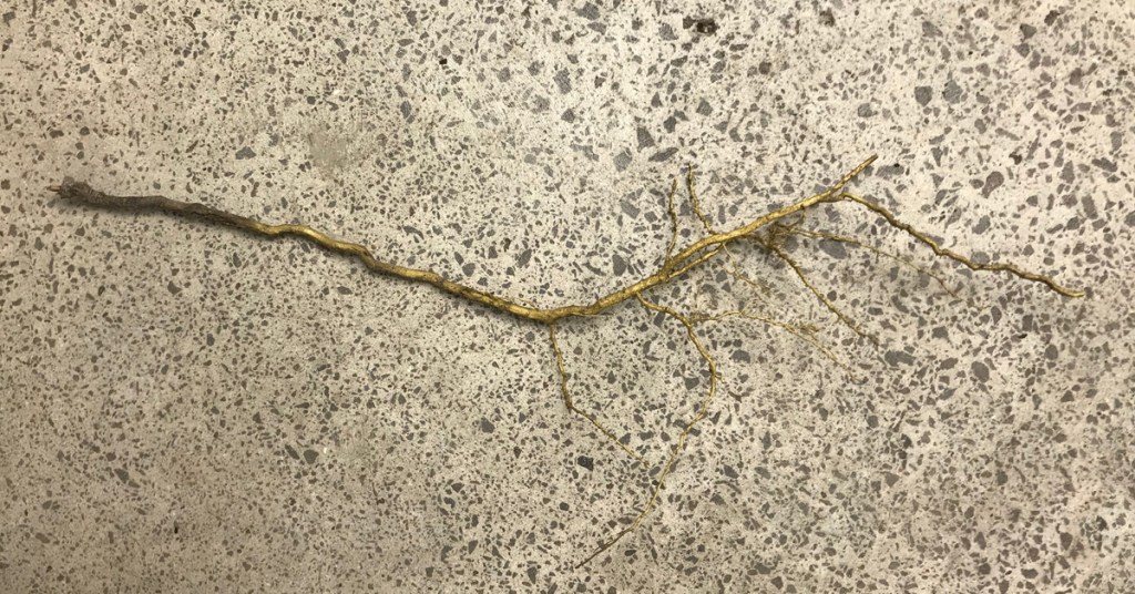 5 Abbie Read, An unsolicited acculturation, 2020, Charred non-native timbers, colonial pedestal, domestic ware, root systems, antique gold thread, hardboard canvas, paint, pencil, epoxy resin, screws