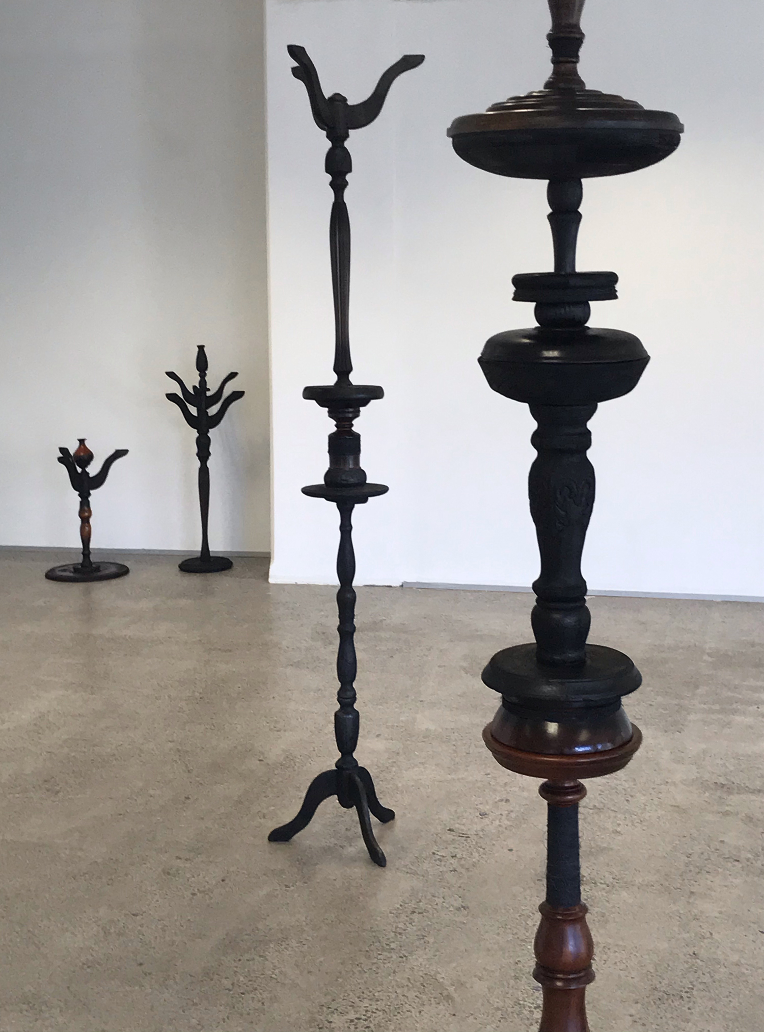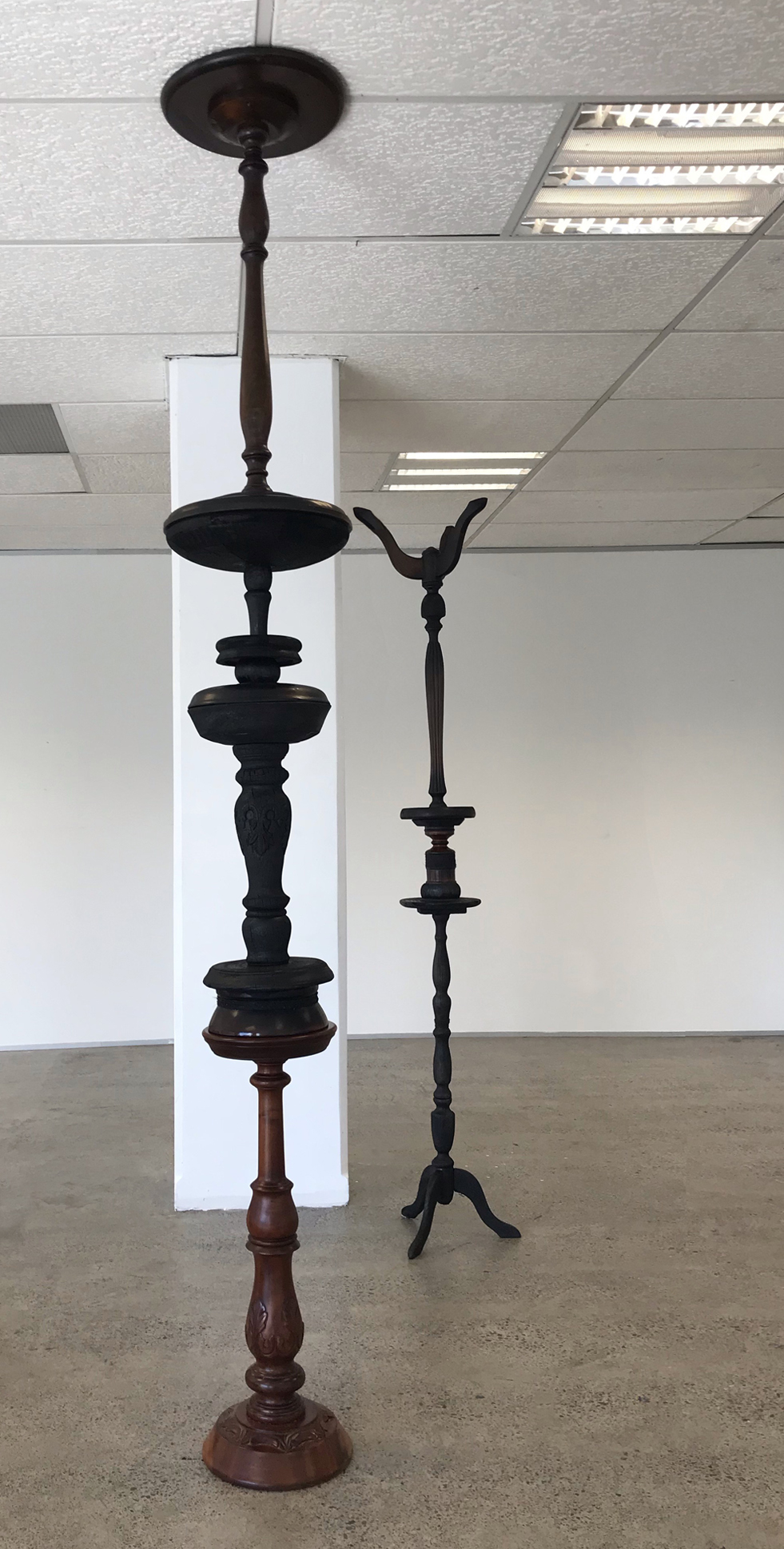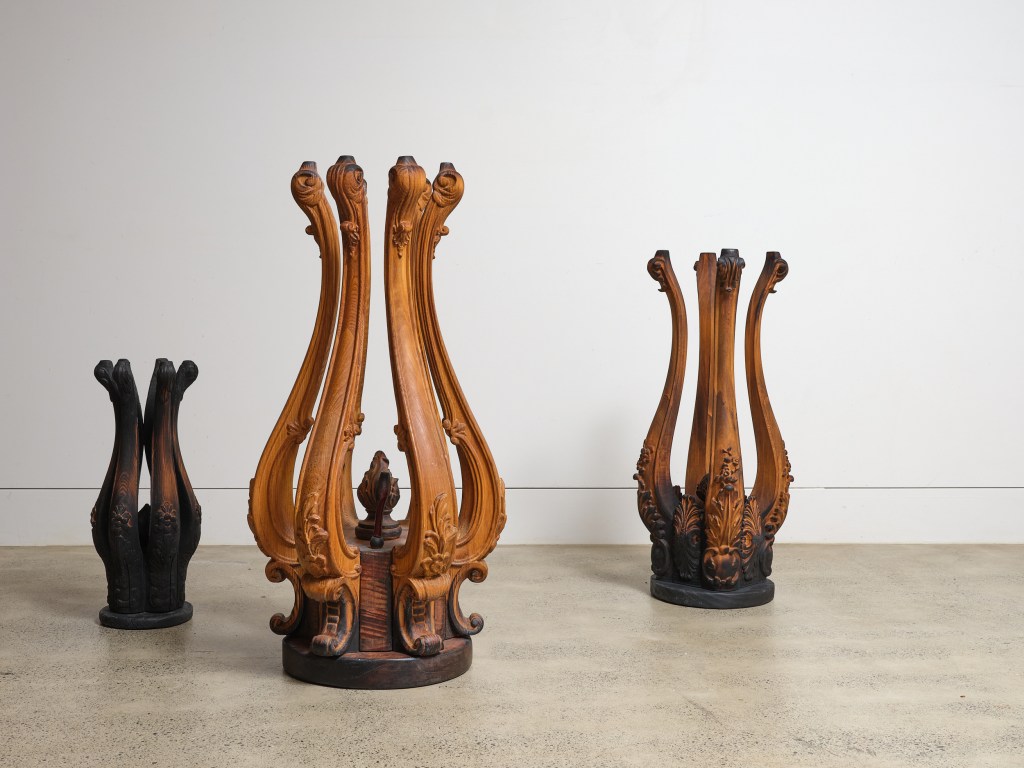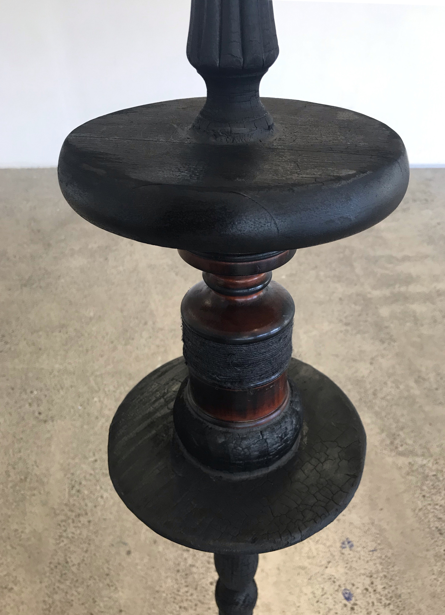 colonial plant stands and wooden pedestals (burnt), wooden vases (charred), blackened twine