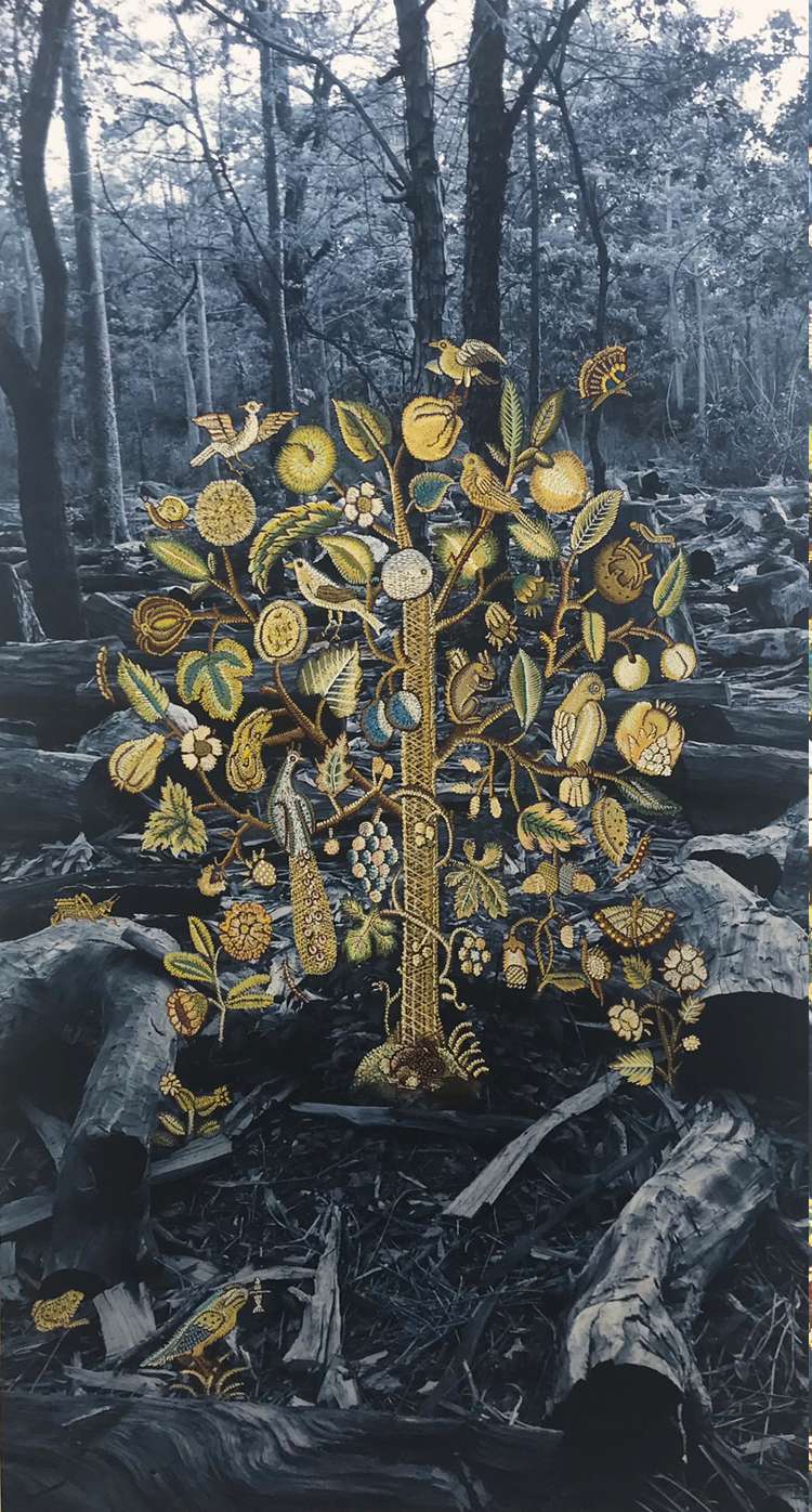 The patterned motifs specifically reference ‘Tree of Life’ carpet designs from diverse cultural contexts. The bold, colourful stylised ornamentation brightly optimistic in contrast to the photographically documented depredation of woodlands which rests behind. There is a global commonality in these two themes. Yet these trees in pattern-form endure also; regenerating and passing through different geographies, cultures and timelines.